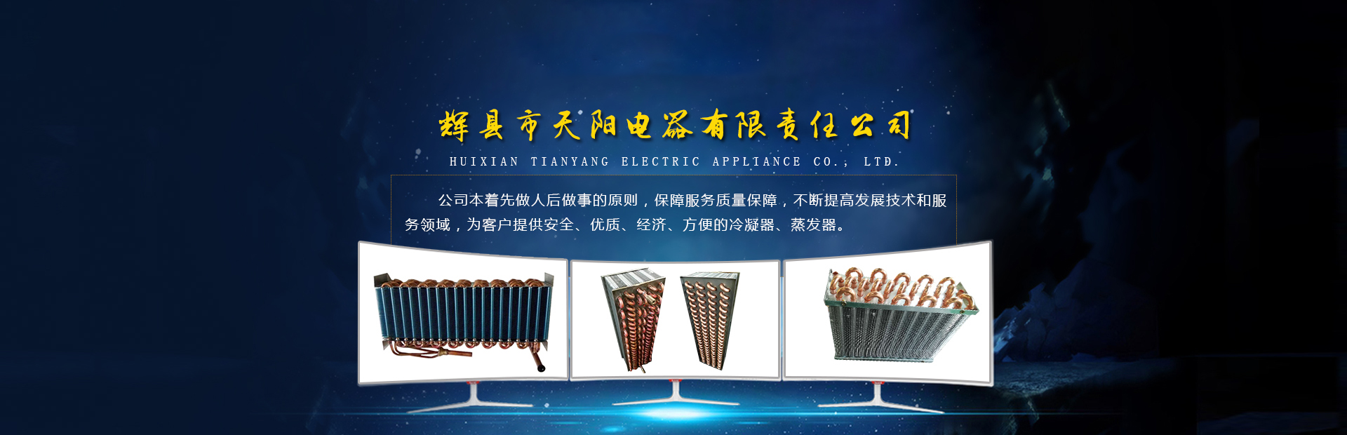 輝縣天陽電器有限責(zé)任公司位于肥沃的中原河南省輝縣市學(xué)院路中段工業(yè)集聚區(qū)興業(yè)園3號廠房,以制冷設(shè)備用冷凝器,蒸發(fā)器,熱交換器為主。主要材料為銅管鋁翅片,銅管銅翅片,鋁管鋁翅片。廣泛應(yīng)用于冰箱冰柜,制冷設(shè)備,暖通設(shè)備,空調(diào),自動售貨機(jī),冷干機(jī),超市立風(fēng)柜,冷藏車,烘干機(jī)等產(chǎn)品領(lǐng)域。  公司自1998年成立以來,始終堅持:“科技造就產(chǎn)業(yè)、質(zhì)量成就信譽(yù)、誠信鑄就輝煌”的質(zhì)量方針,從產(chǎn)品拓展上堅持“人無我有,人有我優(yōu),人優(yōu)我特的”經(jīng)營理念,25年來,從1998年開始供應(yīng)河南冰熊集團(tuán)下屬的冷柜廠,制冰機(jī)廠各種冷凝器;2003年之后,原冰熊集團(tuán)的精英志士開始在全國各地發(fā)展,所到之處依托我公司供貨,以致于多家目前已具行業(yè)中佼佼者的公司,從而建立了如凱雪公司,兆邦公司、凌云公司、海寶公司、正雪公司、上海忠云、山東德萊維等幾十余家公司在草創(chuàng)時期的啟蒙供貨商,友好共贏長達(dá)十余年,成為我國制冷行業(yè)的供應(yīng)商。以致在2015年初雙匯集團(tuán)面向社會的招標(biāo)書中指名要我公司冷凝器、蒸發(fā)器指定產(chǎn)品供應(yīng)商